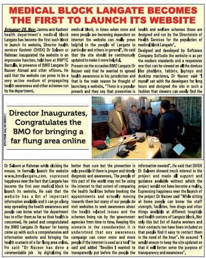 2017 میں اُسوقت کے ڈائریکٹر ہیلتھ سروسز کشمیر ڈاکٹر سلیم الرحمٰن نے میڈیکل بلاک لنگیٹ کی ویب سائٹ www.bmolangate.com کا افتتاح کرتے ہوئے دعویٰ کیا تھا کہ مذکورہ میڈیکل بلاک سارے ملک میں آن لائن ہونے والا پہلا بلاک بن گیا ہے ۔اُنہوں نے اس بات کیلئے اُسوقت کے بلاک میڈٰکل آفیسر (بی ایم او) ڈاکٹر نذیر احمد کی بڑی تعریفیں کی تھیں اور کہا تھا کہ مذکورہ نے اس منصوبہ کے ذرئعہ اپنے دفتر کو ایک منفرد مقام دلوایا ہے۔اگلے دن سرینگر اور جموں سے شائع ہونے والے سبھی اخباروں نے اس خبر کو جلی حروف میں شائع کیا تھا۔